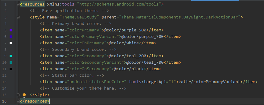 themes.xml 파일에서 툴바의 색깔이나 앱에서 사용할 텍스트의 기본 색 등을 정할 수 있습니다. 어떤 name 값이 어떤 것의 색깔을 나타내는 지는, 어떤 테마를 상속받았느냐에 따라 다르기 때문에 parent="..." 에서 ... 에 대해 검색하시면 됩니다. 저 기본 테마는 Android Studio 새 버전 업데이트할 때마다 금방금방 바뀝니다.