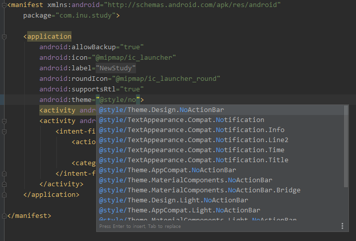 AndroidManifest.xml 파일에서 noActionBar 가 포함된 테마를 선택하면 액션바(toolbar)가 사라집니다. 툴바를 사용하지 않는 앱같은 경우 이런 식으로 없애면 됩니다. 커스텀 툴바를 만들 것이기 때문에 이 테마를 적용하도록 하겠습니다.
