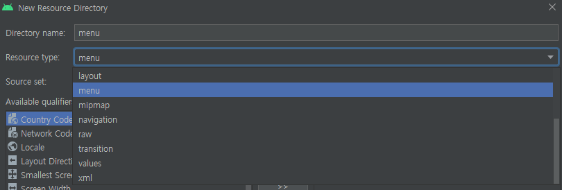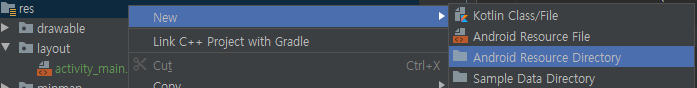 메뉴를 만드는 방법은 메뉴를 위한 xml 을 만들고 배치하고 이벤트를 연결해 주면 됩니다. 먼저 메뉴 xml 부터 만들어 보겠습니다. 메뉴 xml 파일들을 담기 위한 폴더를 만들어 줍니다. res 폴더에서 우클릭으로 만들 수 있습니다.