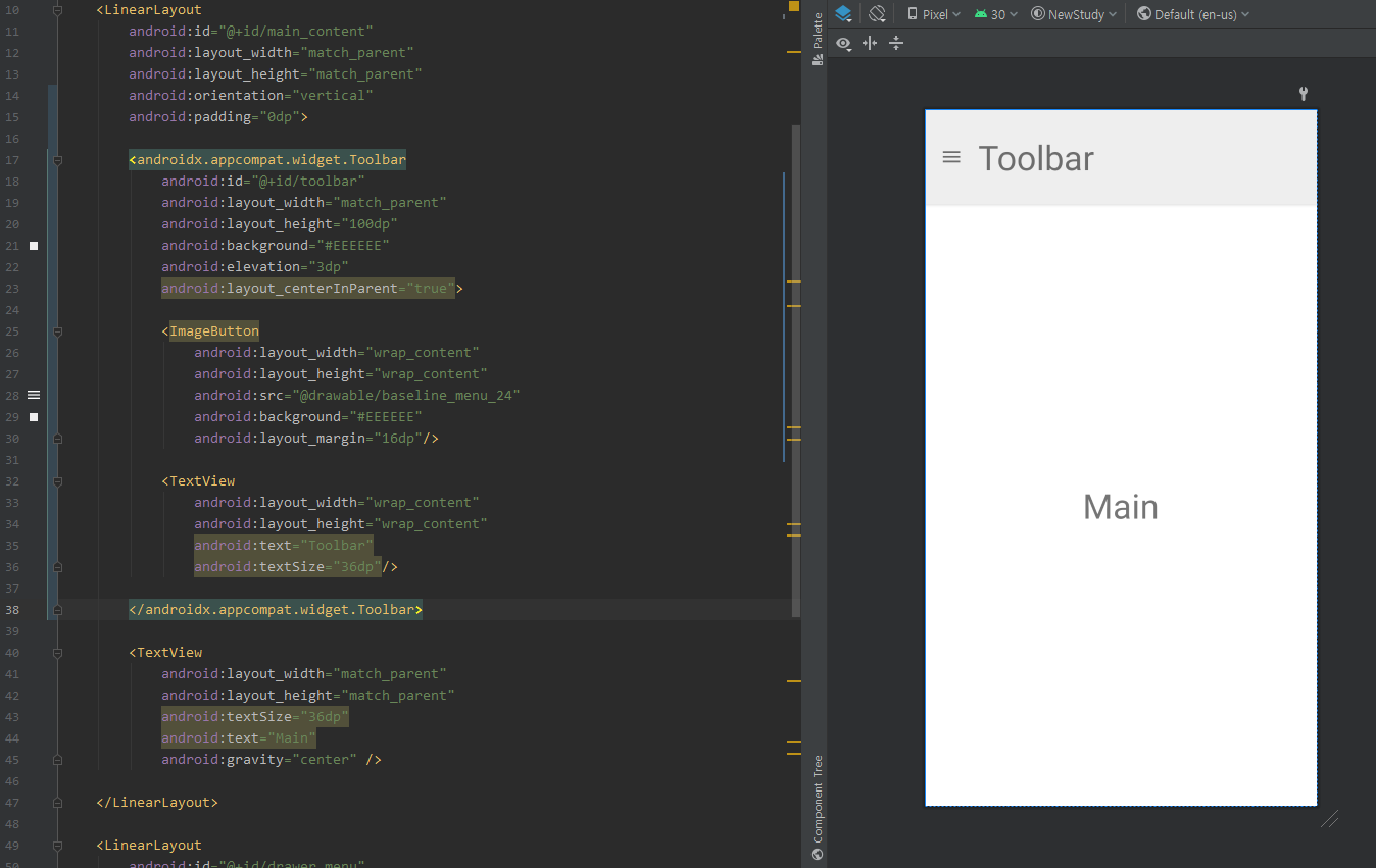메뉴는 두 번째로 만든 햄버거 모양 메뉴가 아니라 처음에 만들었던 메뉴로 바꿔주고, DrawerLayout 과 연결됐던 이벤트는 새로 만든 Toolbar 의 ImageButton 에 연결해주면 훨씬 깔끔해집니다.