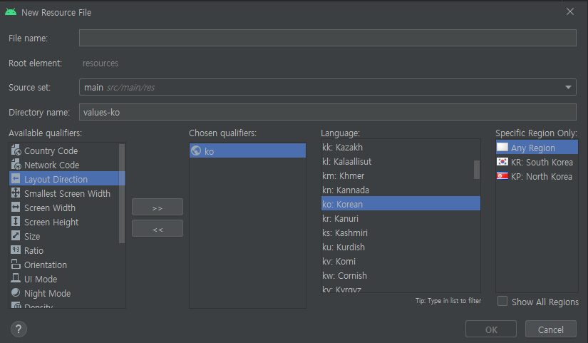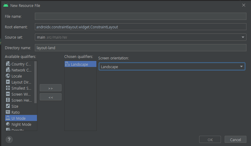 위 화면은 위에서부터 각각 layout 과 values Resource 를 만드는 화면인데요, 왼쪽에 있는 옵션을 >> 버튼으로 추가하면 특정 상황에서만 작동하는 Resource 를 만들 수 있습니다. layout 같은 경우 Landscape 옵션을 넣어 가로모드에서는 해당 레이아웃이 적용되게 만들 수 있습니다. values 에 strings.xml 파일을 지역이나 나라별로 나누어서 만들고, layout 의 text 속성에 텍스트를 직접 넣는 것이 아닌 strings.xml 에 저장한 텍스트의 name 을 전달하면, 휴대폰에 설정된 언어난 한국어냐 영어냐에 따라 다른 언어를 지원하는 것도 가능합니다. 이를 국제화라고 합니다.