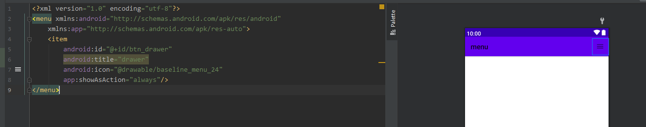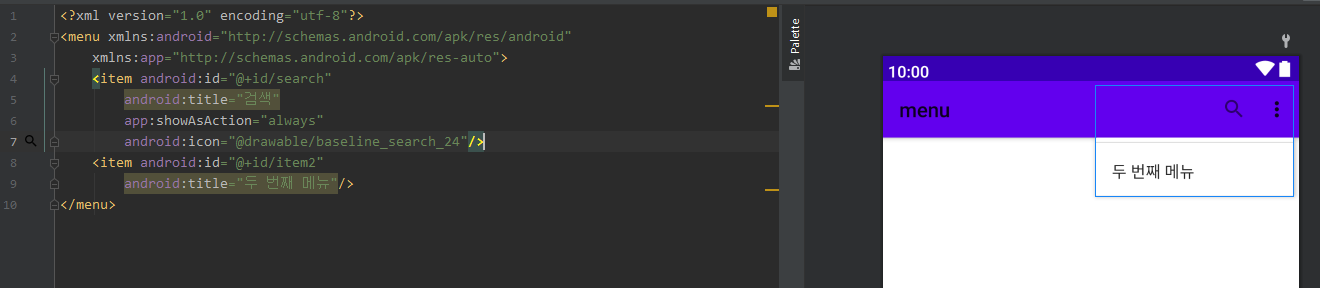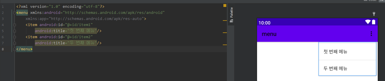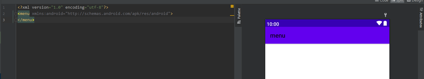 그리고 menu 폴더 우클릭 > New > Menu Resource File 을 통해 메뉴 xml 을 만들어 주면 위와 같은 코드와 화면이 나오게 됩니다. 저는 split 으로 설정했기 때문에 코드와 랜더링 화면이 같이 나옵니다.
