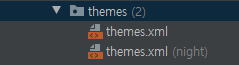 기본적으로 툴바, 스테이터스바를 포함한 스타일, 앱 전체의 색깔 등은 res/values/themes 에 담겨 있습니다. Android Studio 4.0.X 버전까지는 themes.xml 파일이 하나였는데 4.1 이후의 버전에서는 night 모드 사용자가 많아져서인지 개발할 때 night 모드도 같이 신경쓰라고 권장하는 것 같네요. 다시 하나로 바꾸실 수도 있습니다. 괄호 안에 (night) 라고 적혀 있는 건, 실제 파일 이름은 themes.xml 인데 night 모드에서는 저 테마가 적용된다는 뜻 같습니다.