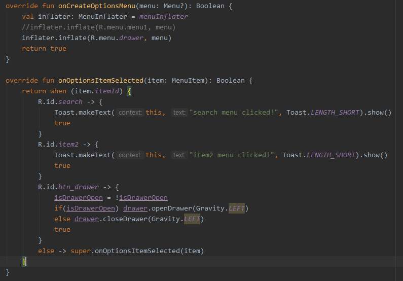 menu 이벤트 자체에 대한 설명은 필요 없어보입니다. 다만, kotlin 문법의 특징이 있습니다. when 은 switch 문과 비슷한데요, kotlin 에서 if 와 when 은 문(statement)이 아니라 식(expression)이라고 부릅니다. a = a + 3 과 같은 식이라는 뜻입니다. when 식에서 각각의 케이스들은 -> 로 람다처럼 표현합니다. 내부 로직이 한 줄이면 else 처럼 {중괄호}를 생략할 수 있습니다. 마지막 명령어가 자동으로 반환됩니다. 위 코드에서는 true 가 반환됩니다.