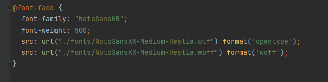 위 사진처럼 css 를 적용하면, 가장 아래에 작성한 woff 폰트만 다운로드 받게 된다. 아무튼 세 번째로 시도한 방법은 가장 용량이 작은 woff2 를 우선 다운로드 받게 해 10 MB 에서 4 MB 로 경량화 하였다. 이 정도면 그래도 봐줄 만 하다고 생각하는데 폰트라는 걸 감안하면 그래도 큰 것 같다.