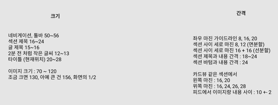 대충 정리한 거라 부끄럽지만 대략 이런 식이다. 디자인 유튜브로 심심할 때마다 보고 있다. 그 유튜브에서는 모바일 디자인에서 정말 작은 폰트에서도 12 폰트를 사용한다고 했는데, 실제로 사이즈를 확인해 보니 12폰트보다 작은 폰트를 아직까지 못 봤다. 디자인할 때 크기를 항상 100%로 놓고 디자인하는 것은 아니기 때문에 내 감각에 의존하기보다는 데이터를 기반으로 디자인하는 편이다. 꼭 미적 감각 뿐만 아니라 취약 계층에 대한 접근성이나 UX 측면에서도 많이 고려해야 한다.