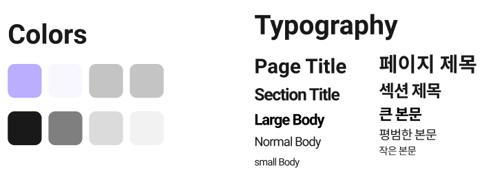 컬러랑 글자 사이즈, 폰트, letter spacing 등을 미리 정해놓고 그 안에서만 사용하고 있다. 물론 다른 컴포넌트들도 정리하고 있다. 이렇게 해야 디자인할 때도 편하고 개발할 때도 편하다. 폰트는 사실 크게 고민하지 않고, 영어는 Roboto, 한글은 Noto Sans KR 을 사용했다. 프로젝트 경험을 몇 번 해본 이후에는 디자이너분들께 스타일 가이드를 미리 정리하면 서로가 편하다고 꾸준히 말씀드리고 있다. (반영된 적은 없지만...)