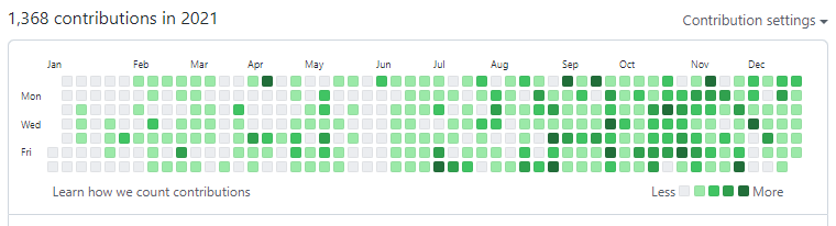 6월부터는 나름 1일 1커밋을 지키려고 했는데 막상 해 보니 쉽지는 않은 것 같다. 그래도 2020년까지의 커밋 수를 합친 것보다 2021년 커밋수가 더 많다. 그 전에는 개발을 거의 안 하긴 했지만... 2022 년에는 2000 개 이상의 커밋을 남기고 싶다. (물론 커밋 수가 중요한 것은 아니다. 1일 1커밋을 하는 것은 잔디를 채우기위한 목적보다 매일 1커밋 분량이라도 공부하고 있다는 것이 중요하다.)