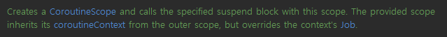 coroutineScope 는 코루틴 스코프를 만들고 람다를 실행한다. 마찬가지로 수신 객체 타입을 파라미터로 받는다.