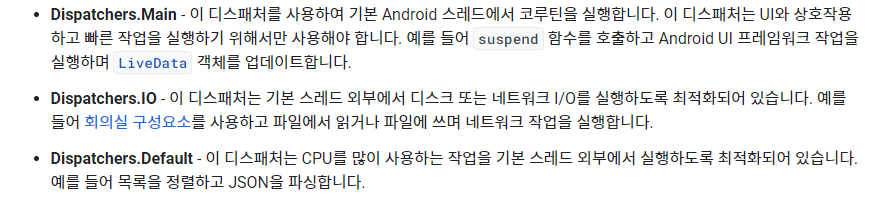 코루틴은 세 가지 Dispatcher 를 제공한다. ( 참고자료 ) 코루틴 스코프 안에서 실행되는 로직은 비동기 작업은 만나면 잠시 중단 됐다가 비동기 작업이 끝나면 다시 실행된다. 이때 어떤 스레드에서 실행될 것인지 Dispatcher 를 통해 지정할 수 있다. UI 작업을 하는 게 아니라면 굳이 Main 스레드를 사용할 필요는 없는 것 같다.