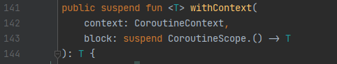 withContext 는 두 개의 파라미터를 받는다. 첫 번째는 코루틴 컨텍스트이고 두 번째는 수신 객체 타입의 코루틴 스코프이다. 수신 객체 타입은 확장 함수처럼 동작한다. 여기선 코루틴 컨텍스트로 Dispatchers.Main 을 넘겨 줬는데, Dispatchers.Main 의 상속 구조를 타고 올라가면 코루틴 컨텍스트를 구현하고 있다. 수신 객체 타입으로 CoroutineScope. 를 받고 있으므로 이 메소드는 반드시 코루틴 스코프 안에서 사용되어야 한다. (혹은 suspend) 실제로는 CoroutineScope 라는 클래스 안에서 this.withContext(Dispatchers.Main) 을 호출한다고 생각하면 된다.