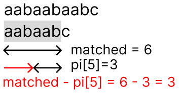 계산 식에 대한 설명이다. 식이 바로 이해가 됐다면 넘어가도 된다. pi[matched - 1]는 공통 접두사와 접미사의 길이이다. 접미사의 시작 위치로 옮기더라도 이 길이만큼은 이미 일치함을 알고 있다. 따라서 다음 위치는 접미사의 시작점이 되어야 한다. 빨간 화살표만큼 이동해야 접미사의 시작점으로 이동하므로 위와 같은 식이 나온다. 부분 일치 문자열의 길이가 짧으면 다음 시작 위치를 많이 건너뛰게 된다. 부분 일치 문자열의 길이가 길다면 다음 시작 위치는 가깝지만 비교 연산을 덜 해도 된다.