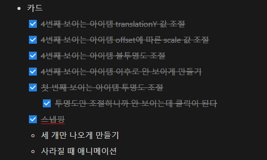 아무래도 한 번에 구현할 수 있는 UI는 아니어서 단계별로 나누어 구현했다. 위 사진은 노션에 대충 휘갈겨 놓은 내용으로 나만 알아볼 수 있다. 막상 구현해 보니 어려운 건 없었다. 한 가지 어려운 게 있다면 원래 디자인은 원형큐 형태로 나왔는데, 지금은 끝이 존재하는 형태이다. 구현할 때 정해놓은 대략적인 단계는 다음과 같다.
