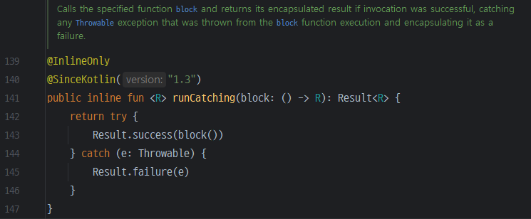 Result는 Kotlin 1.3버전부터 사용가능한, 언어에서 지원해 주는 예외 처리 관련 클래스이다. 예시에서는 일부 함수만 사용했지만 다양한 메서드를 지원한다.
