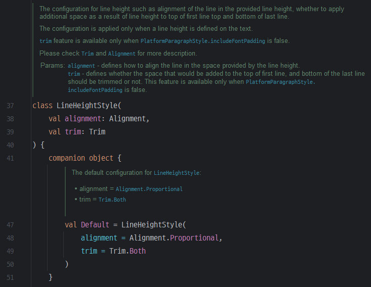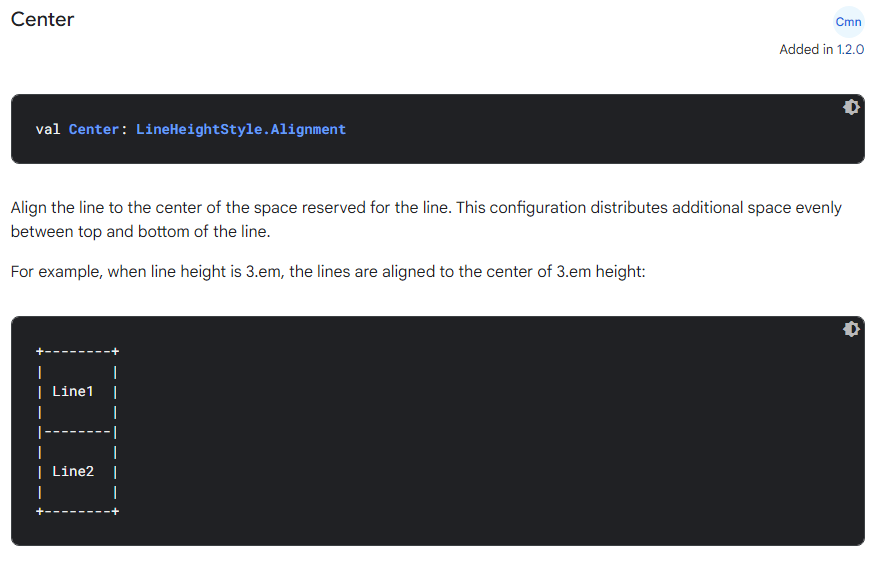 "글자와 아이콘의 정렬이 안 맞아요." 기존 방식에서는 추가 여백을 모두 잘라버렸기 때문에 Alignment.CenterVertically를 적용하면 가운데로 정렬되었다. 폰트 패딩을 잘라내지 않으면 lineHeight에 여백이 생기게 되는데, LineHeightStyle의 alignment는 lineHeight 내부에서 텍스트를 어떻게 정렬할 것인지를 나타낸다. 주석에서 확인할 수 있는 line이라는 표현이 조금 모호하다고 생각되는데, 공식문서를 살펴보면 좀 더 명확하게 이해할 수 있다.