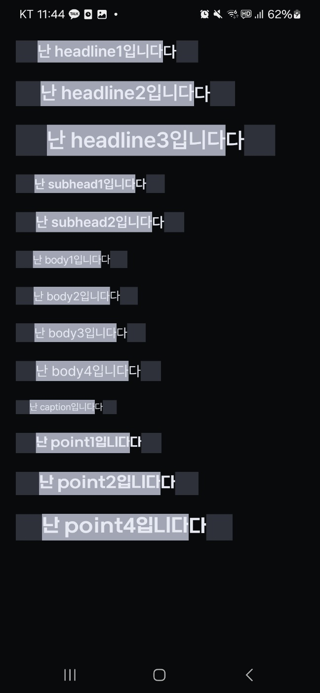 혹시나 필요할 시각보정을 위해 위와 같이 앱 내에서 사용하는 모든 폰트를 출력해 보았다. 사각형(아이콘 대체)은 lineHeight 크기와 동일하고, 폰트의 lineHeightStyle은 Time.None과 Alignment.Center를 적용했다. 배경을 넣지 않은 마지막 "다"는 Proportional와 Trim.Both가 적용되어 있다.