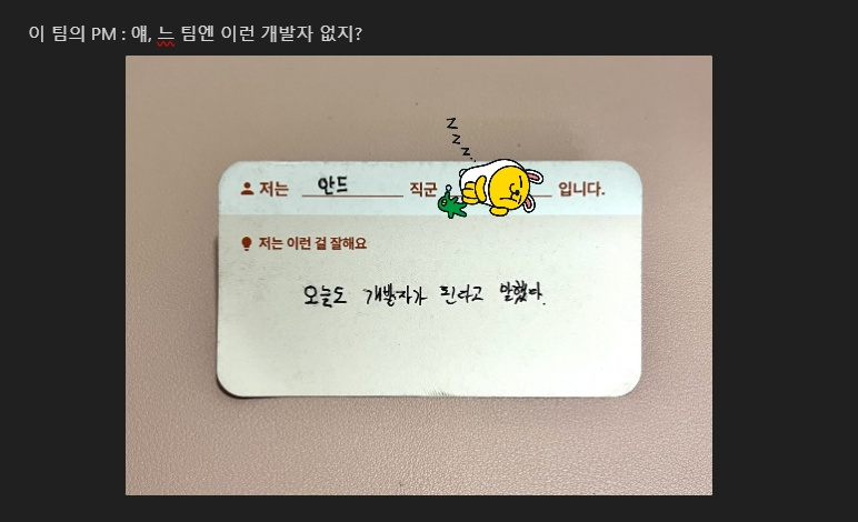 이번에는 수기로 작성할 수 있는 명함 카드를 5장 받았다. 이 명함을 팀빌딩시 PM에게 전달하면 된다. 나는 수전증(본태성 떨림) 때문에 글씨를 잘 못 써서 짧게 작성했다. 명함에는 어떻게 재밌는 문구를 적을 수 있을지를 고민했고 그때 쓴 캣치 프라이즈 문구가 팀 소개 노션에 박제되었다. "오늘도 개발자가 안 된다고 말했다"라는 책 제목에서 착안하여 "오늘도 개발자가 된다고 말했다."라고 작성했다.