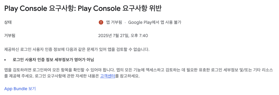 구글에서 제공해준 스크린샷 확인 결과 번역의 문제로 판단된다. 로그인에 필요한 정보가 하나가 아니라 상세 정보를 통해 로그인 방법을 설명했다. 그 과정에서 "길동"과 같이 한글로 된 테스트 계정을 제공했는데, 심사 과정에서 "길동"이 아닌 "Gil-Dong"을 사용하여 문제가 되었다.