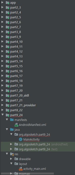 공부하면서 코딩한 건 github.com/HamBP/AndroidProgrammingMissions 여기에 올라가 있다. 근데 저건 도전 문제들이고, 예제를 코딩한 건 깃허브에 올리지 않았다. 예제를 코딩하기 위해 아래 사진만큼 모듈을 만들었다. 모듈 안에서도 런처 액티비티가 2~4개씩 있다.