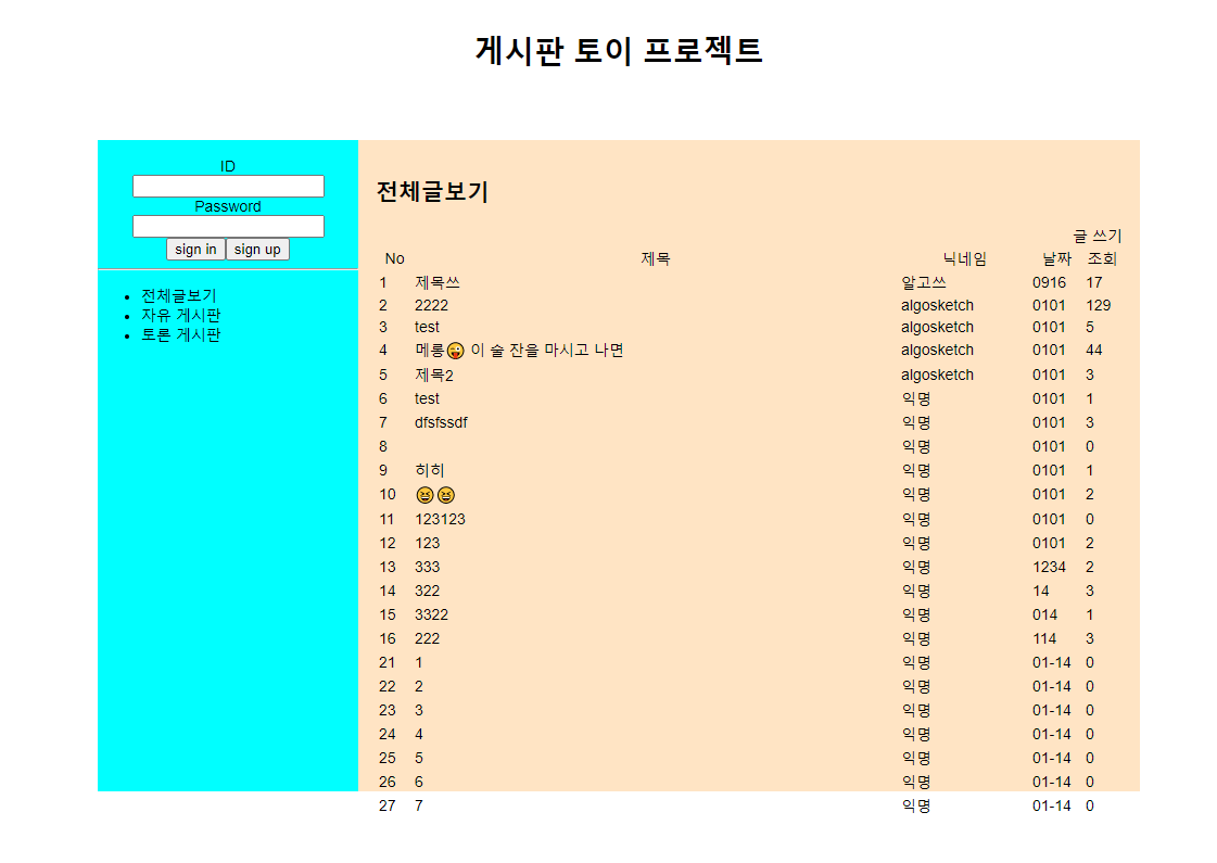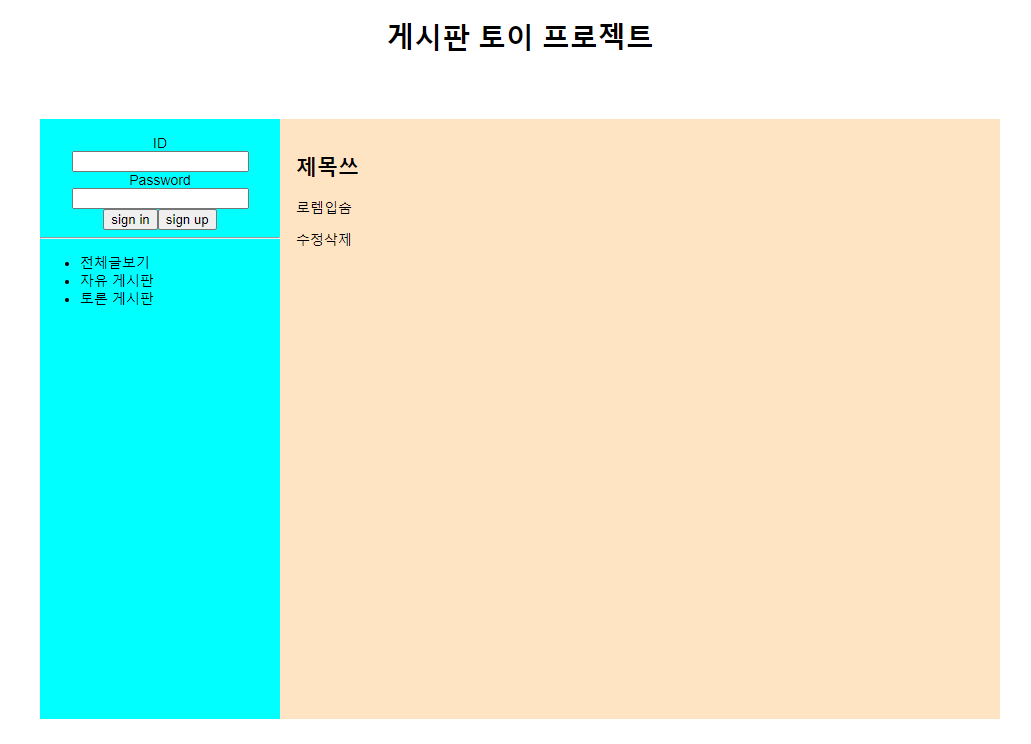 디자인보다는 기능 위주로 구현하고 있고 저렇게 색칠한 이유도 분할된 게시판의 영역을 눈으로 확인하기 위함이다.