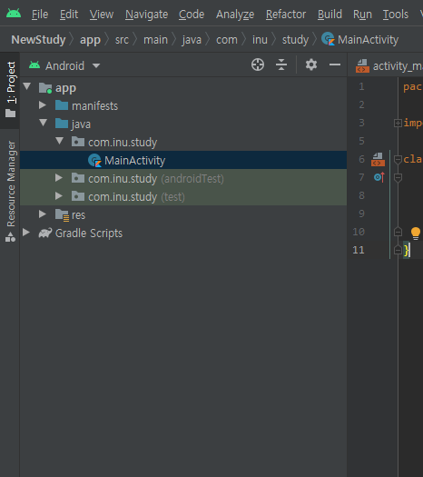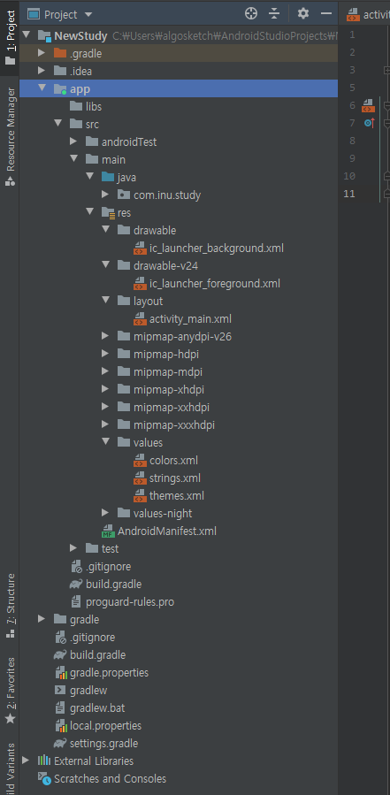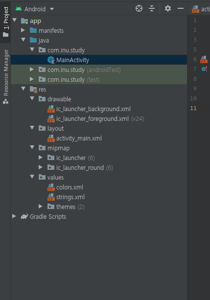 가장 먼저 폴더 구조를 살펴봅시다. 파일은 소스와 리소스로 나눌 수 있습니다. res는 resource를 줄인 말입니다.