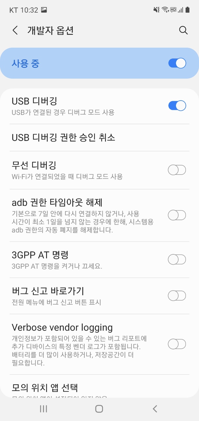 개발자 옵션에서 USB 디버깅 옵션을 켜 주시면 준비가 완료됩니다. 단, LG 휴대폰의 경우 수동으로 드라이버를 설치해 주셔야 컴퓨터가 제대로 인식할 수 있습니다.