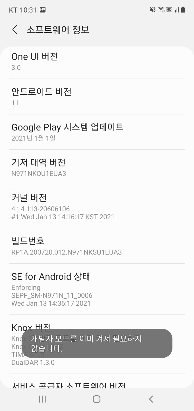 그리고 빌드번호를 10번 정도 터치하면 개발자 옵션이 활성화 됩니다. 저는 이미 활성화시켰기 때문에 그 과정은 생략됐습니다.