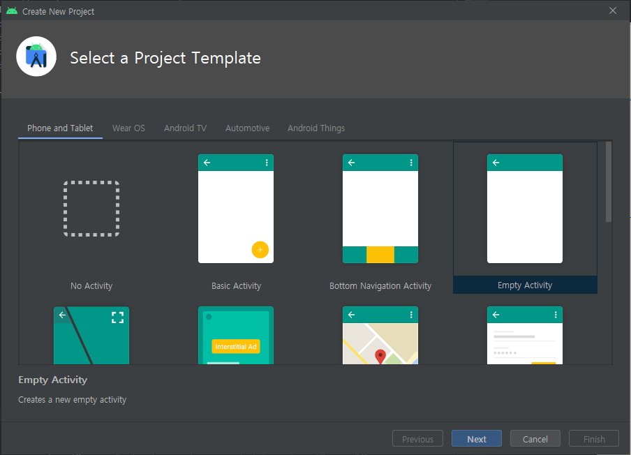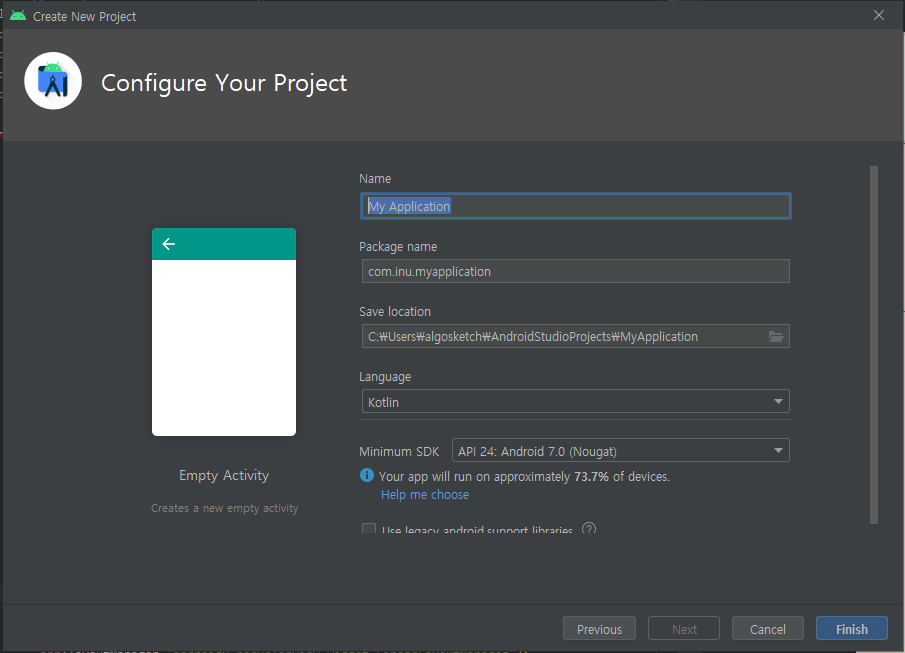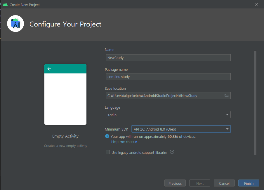 Name에 프로젝트 이름, Package name에 패키지 이름을 작성해 주시면 됩니다. 패키지 이름은 마음대로 지으셔도 되나 자동으로 생성되는 com.example.* 와 같은 패키지 이름으로는 앱 출시가 불가능합니다. 또한 출시하기 위한 패키지 이름은 유일해야합니다. 다른 앱과 패키지 이름이 겹쳐선 안 됩니다. 출시할 것이 아니라면 상관 없습니다.