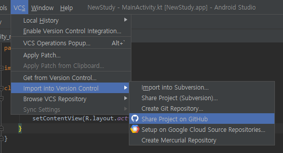 하지만 개발자가 모든 파일을 다룰 필요는 없기 때문에 Android로 놓고 사용하시면 됩니다. 이제 이 프로젝트를 깃허브에 올리려고 합니다. git은 VCS(Version Control System)이고 깃허브는 git으로 관리되는 프로젝트들을 올릴 수 있는 원격 저장소입니다. 안드로이드 스튜디오에서는 다음과 같은 방식으로 깃허브를 지원합니다.