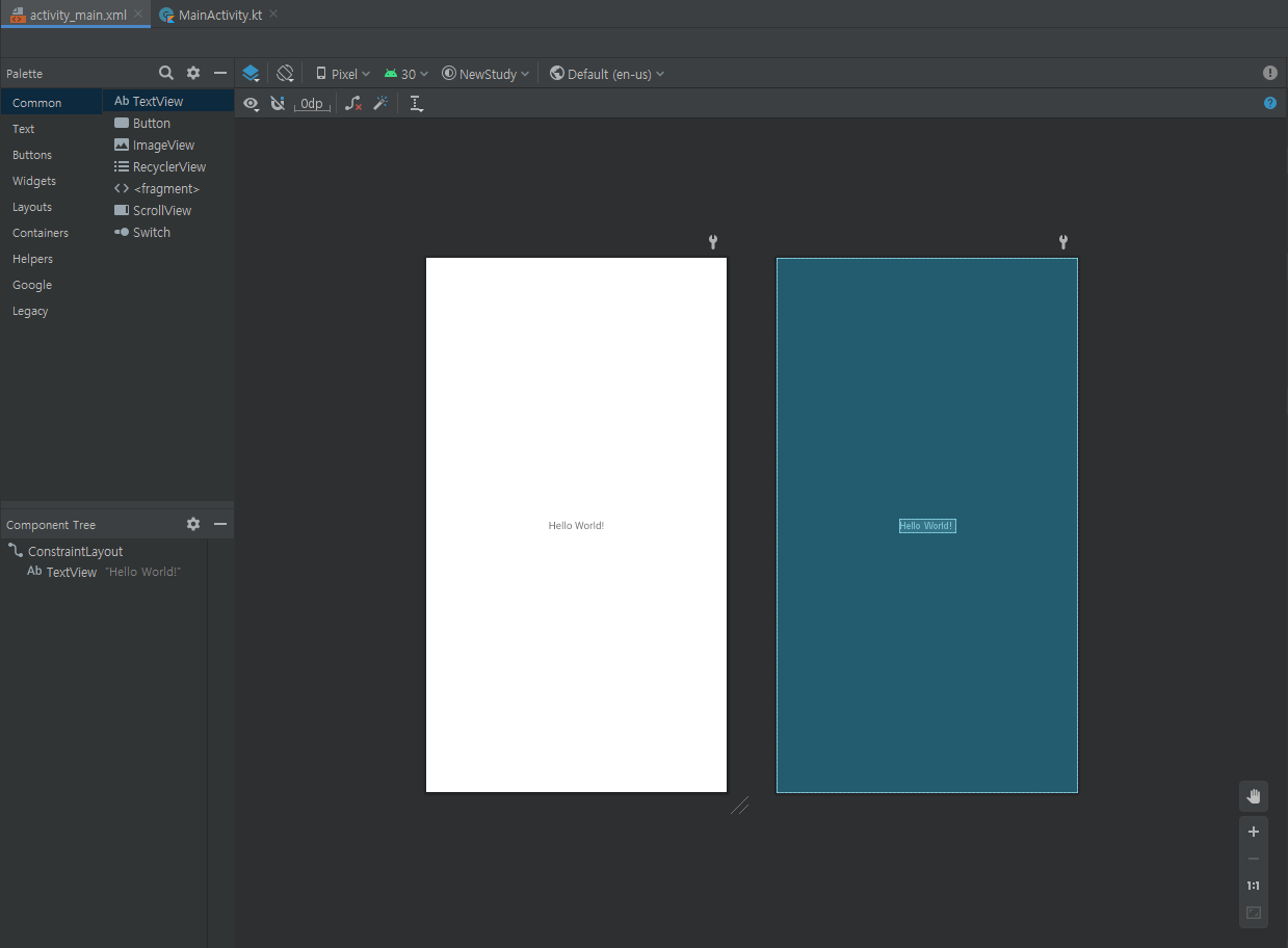 Design 탭을 열면 이런 화면이 뜨며, 왼쪽의 도구들을 드래그하며 화면을 채울 수도 있지만 우리는 코드로 작성하도록 하겠습니다. Design 화면에서는 코드를 자동으로 생성해 주지만 레이아웃을 정확히 이해하기 위해 저는 99% 이상 코드로 작성합니다.