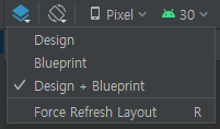 상단의 드롭다운 메뉴에서 UI의 크기나 간격 등을 확인할 수 있는 파란 화면을 없앨 수 있습니다.