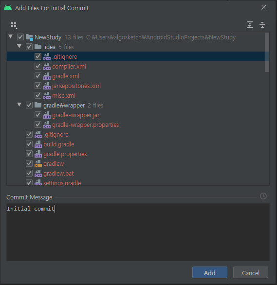 위 화면이 뜰 텐데 깃허브에 올릴 파일을 선택하는 것입니다. 기본으로 전부다 선택이 되어 있는데 그대로 Add 버튼 누르시면 됩니다. 참고로 .gitignore 파일은 깃허브에 올리지 않을 파일을 지정하는 파일입니다. github.com/HamBP/NewStudy 제 깃허브에 리포지토리가 생겼습니다. 처음엔 깃허브 로그인 화면이 뜰 수 있습니다.