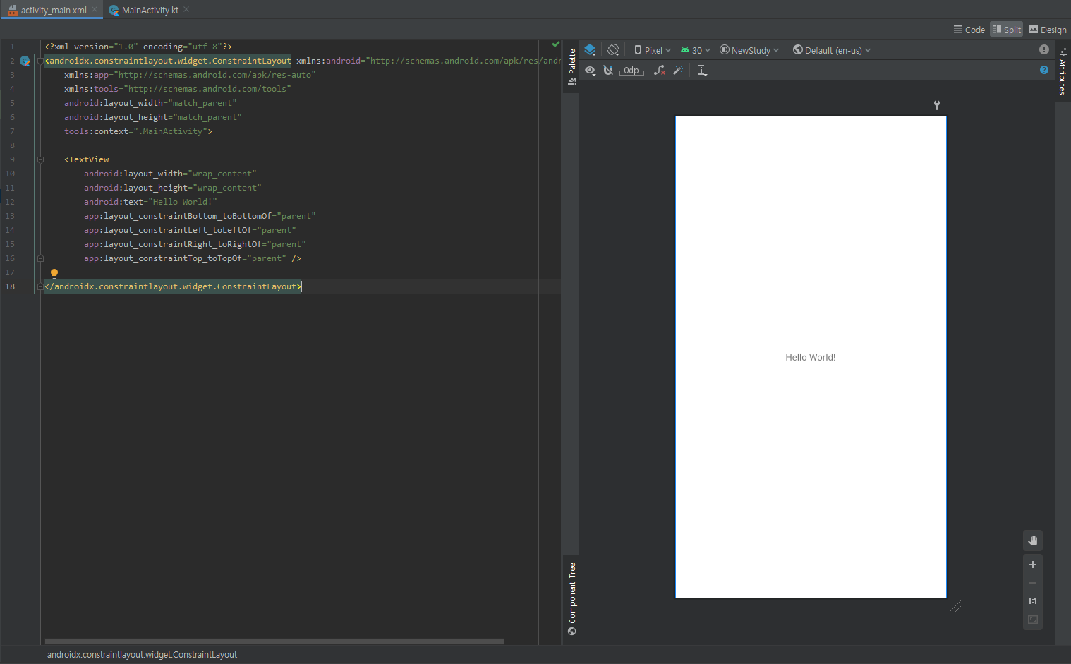 안드로이드 스튜디오는 xml을 사용합니다. xml의 ml은 Markup Language의 약자로 html을 해보신 분이라면 어느정도 익숙하지 느껴질 것입니다. layout의 xml파일은 위와 같이 생겼습니다. 우측 상단을 보시면 Code, Split, Design 탭이 있는데, 저는 Split으로 놓고 작업합니다. 좌측이 코드, 우측이 렌더링된 화면입니다. 코드를 작성하면 오른쪽 화면에 띄워주는 구조입니다.