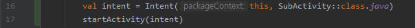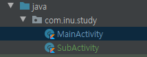 서브 액티비티를 실행하는 코드는 startActivity()로 Intent 객체를 인자로 받습니다. 그리고 Intent는 서브 액티비티에 대한 정보를 갖고 있어야 합니다. 그래서 Intent 객체를 미리 만들어 주었는데, Intent의 생성자는 Context와 서브 액티비티 class자체를 받습니다. 서브액티비티 클래스는 액티비티를 만들면서 자동으로 추가됩니다.