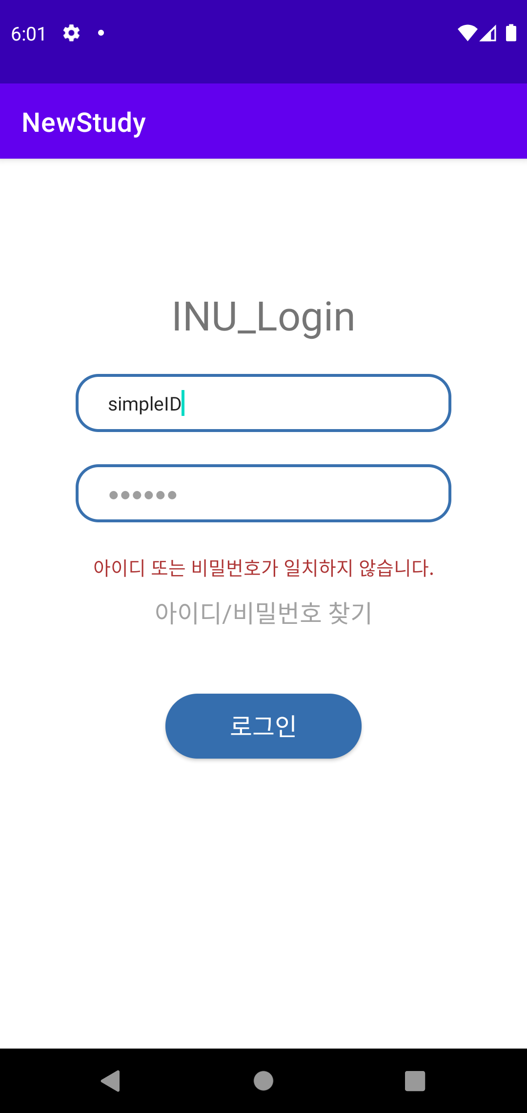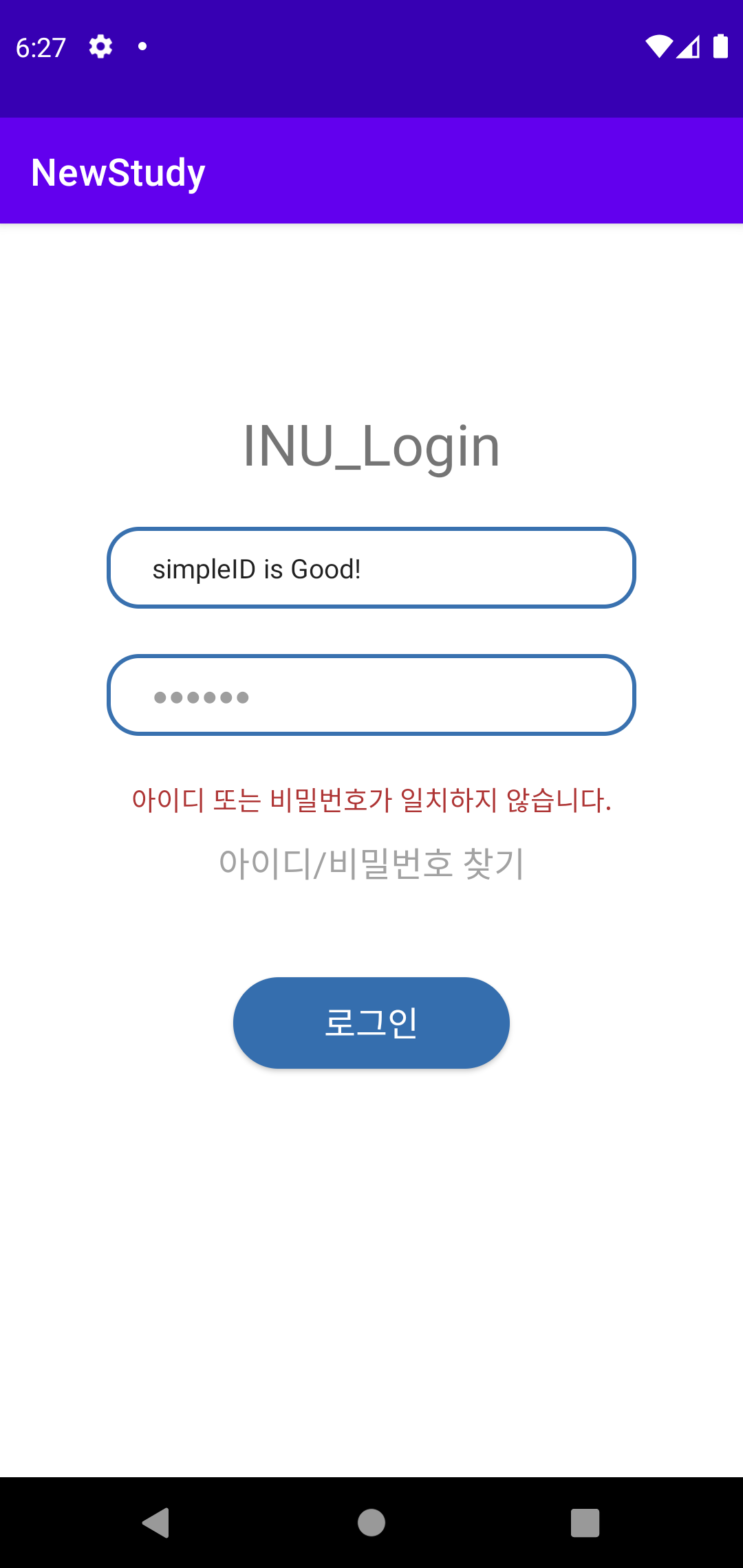 - 아이디 혹은 비밀번호를 입력하지 않았을 때 : 아이디 혹은 비밀번호를 입력하라는 한다는 토스트 메시지