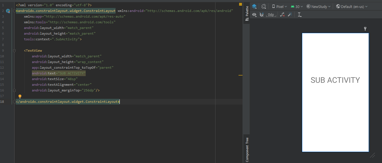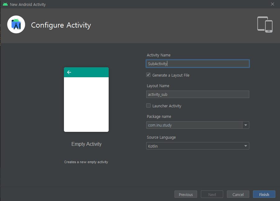 프로젝트를 처음 만들 때와 동일하게 Empty Activity로 생성한 뒤 이름을 정하고 Finish를 눌러주세요. 그리고 activity_sub.xml 파일을 열어 TextView만 추가해 줍니다.
