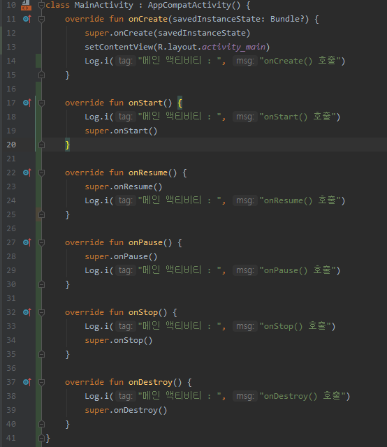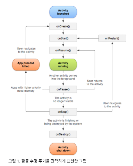액티비티는 특정 상황에서 자동으로 메서드를 호출합니다. 액티비티가 만들어질 때, 화면을 출력할 때, 일시 정지할 때, 완전히 종료될 때 등이 있습니다.