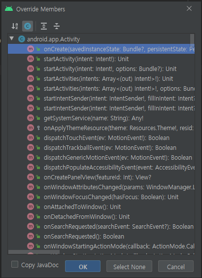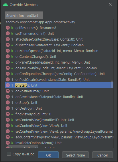 당연하게도 액티비티 생명주기와 관련된 7가지 메서드 모두 오버라이딩할 수 있습니다. 무언가를 상속 받는 클래스 내부에서 오버라이딩 가능한 메서드 목록은 단축키 'Ctrl+O'로 확인할 수 있습니다.