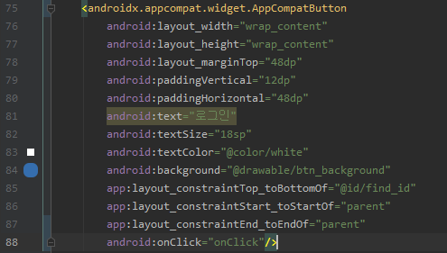 먼저 xml에서 지정하는 방법을 살펴보도록 하겠습니다. xml에서는 onClick 이라는 속성에 클릭 이벤트를 구현한 함수 이름을 넣어주면 됩니다.