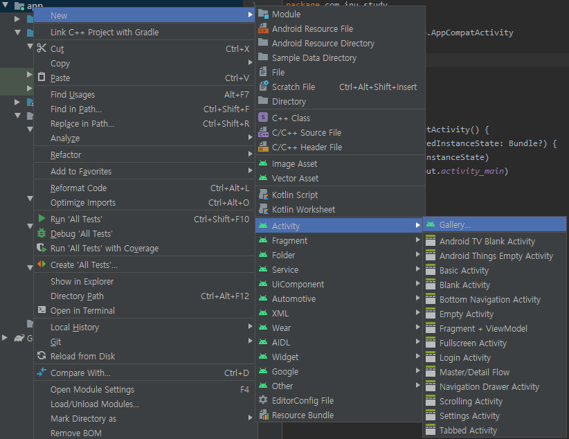 우선 서브 액티비티를 띄우기 위해선 새 액티비티를 만들어야 합니다. 상단 탭의 File에서도 찾을 수 있고 app 디렉터리나 적당해 보이는 디렉터리 아무곳이든 우클릭하면 새 액티비티를 만들 수 있습니다.