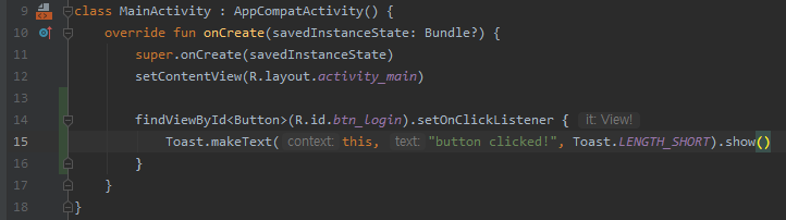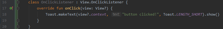 이번에는 코틀린 코드에서 지정하는 방법입니다. 위와 동일한 결과를 내는 코드를 작성해 보겠습니다. setOnClickListener는 해당 뷰를 클릭했을 때 발생하는 이벤트를 지정하는 메서드입니다. 이 메서드의 인자로 View.OnClickListener 인터페이스를 상속 받아 구현한 클래스의 객체를 넘겨줘야 합니다.