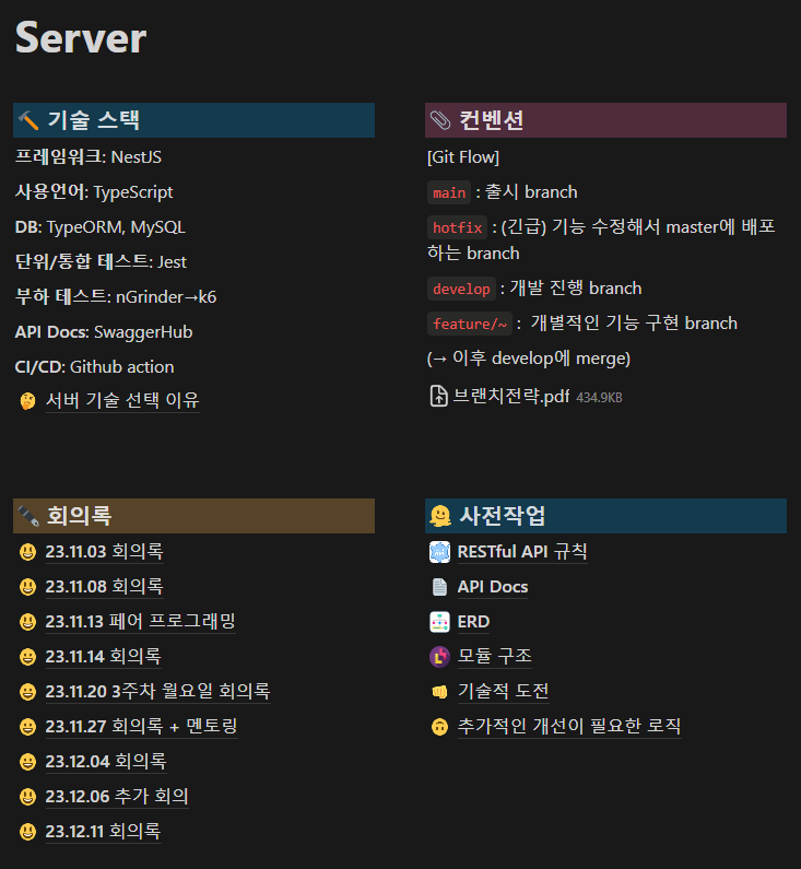 사실 제목은 어그로이고, 극찬까지는 모르겠지만 칭찬을 받은 건 맞다. 프로젝트에 문서에 대해 운영진, 동료 캠퍼, 자문위원(내 기준 유명하신 분), 멘토님께 칭찬을 받았다. 특히 운영진께서 슬랙 채널에 우리 프로젝트 노션을 공유해 주시기도 했다. 우리 프로젝트 문서 페이지는 이렇게 생겼다. 캡처된 것 외에도 더 많은 내용이 있으니 궁금하다면 링크를 참고하길 바란다.